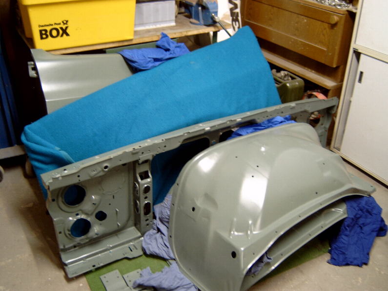 Frontblech, Kotflügel, Innenkotflügel und Heckklappenscharniere wurden gestrahlt und pulverbeschichtet.